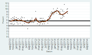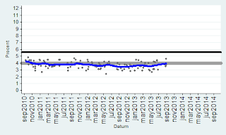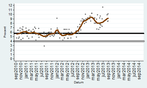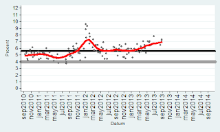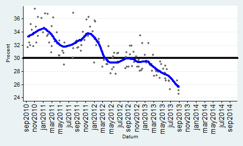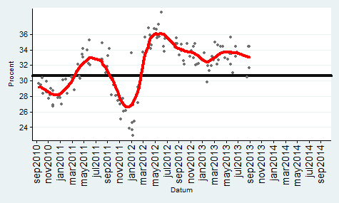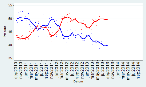 Bilderna är intressanta… Det som slår mig är att skillnaden mellan de rödgröna och alliansen var drygt 3% ett år före valet 2010… Idag är det närmare 10%. Dessutom har regeringen suttit i 2 mandatperioder och det är svårt att vinna 3 val i rad… Det har de borgerliga aldrig klarat…Reinfeldt är rökt.. En annan mycket intressant faktor är Sverigedemokraterna… Dom har i praktiken fördubblats sedan 2010… Trots att medierna vägrar att diskutera konsekvenserna av massinvandringen… Dvs brottsligheten, bidragsberoendet, utanförskapet, arbetslösheten, bostadsbristen, bidragsfusket etc…Verkligheten är en omöjlig motståndare… Norge, Danmark har idag (söndagen den 8:e september) S ledda regeringar som för en helt annan politik när det gäller invandring än Sverige… Varför kallar man inte dom för nazister, rasister, främlingsfientliga etc… För att inte tala om Finland som alltid haft en mycket restriktiv politik. Schweiz, Kanada, Australien är 3 andra exempel… Storbritannien stramar åt…Detta får inte diskuteras av PK eliten… Alla andra länder för en annan politik än oss… Fast det är klart snart har vi arbetskraftsbrist på analfabeter från Somalia… Arbetsförmedlingen talar öppet om en snar arbetskraftsbrist… Den politik som 7 klövern för leder till att vi kommer få riktiga nazistpartier i riksdagen snart… Se på Grekland och Ungern… När välfärden havererar pga kostnaderna så kommer det en kraftig motreaktion. När folk förstår att politiker, tjänstemän och journalister ljugit om konsekvenserna i 25 år… Då blir dom ursinniga…Sverige tar emot fler flyktingar än Storbritannien och det klarar vi inte… Assar Lindbeck konstaterade i våras att vi inte har råd med denna invandringspolitik. Hans Bergström (fd chefredaktör på DN) skrev i Skattebetalarnas tidning Sunt förnuft om detta redan vintern 2012…I Sverige har vi ett antal editioner av Pravda… Samt ett stort antal ryggradslösa skitar… Syrien är ett annat exempel på det… Ibland måste man ta svåra beslut annars är man bara en liten skit… I EU finns det gott om stora skitar… Det är nödvändigt att intervenera där, det skulle ha gjorts för länge sedan… Dagens politik visavi Syrien påminner starkt om politiken mot Spanien på 30-talet.. Vi skiter i dom… Tyskland och Ryssland skickade vapen till Spanien… Idag skickar bara Ryssland vapen… Vem blir 3:a i valet nästa år? Svaret är SD… Gå in och titta på oddsen på Ladbrokes…Valet 2014 – Bäst av 6Val OddsSverigedemokraterna (sd) 1.40Miljöpartiet (mp) 3.25Vänsterpartiet (v) 6.50Folkpartiet (fp) 17.00Centern (c) 67.00Kristdemokraterna (kd) 101.00http://privat.bahnhof.se/wb492673/34%20Main%20frame%20Odds2014.htmlSpel är säkrare än opinionsmätningar. Det visar erfarenheterna från USA och Storbritannien som har haft detta i årtionden…Sedan måste man erkänna att det är 1 år kvar till valet och en hel del kan hända… Jag har dock oerhört svårt att se hur alliansen ska kunna vända detta…Vilka problem har alliansen löst under sina snart 7 år vid makten?Arbetslösheten, utanförskapet, bostadsbristen, sociala problem, infrastrukturen, skolan, polisen, rättsväsendet, sjukvården, företagsklimatet och så vidare….Man har inte löst någonting alls… Ok riskkapitalisterna kommer rösta på M för att dom slumpat bort offentlig egendom..JM