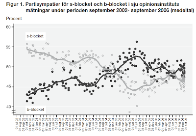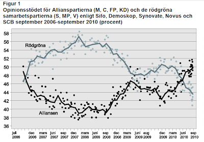 Men minnet är som vanligt kort. Man behöver då och då påminna sig om dramatiken under gångna mandatperioder för att inte gå vilse i spekulationerna om vad dagens opinionsläge egentligen betyder för den fortsatta kampen om regeringsmakten. Nedan visas hur avståndet mellan de rödgröna och Allianspartierna har förändrats under mandatperioderna 2002-2006 och 2006-2010. Figurerna är hämtade från SCB-rapporterna Alliansseger respektive Åttapartivalet. De största och dramatiska förändringarna representeras av det opinionsår med obrutna framgångar som följde efter Alliansens bildande sommaren 2004, Alliansens katastrofstart på sin regeringstid efter valet 2006, den rekordstora rödgröna ledningen som eroderade stadigt efter finanskrisen hösten 2008 och, slutligen, den dramatiska och snabba omsvängningen i maj 2010 då Alliansen kopplade greppet inför riksdagsvalet den hösten.