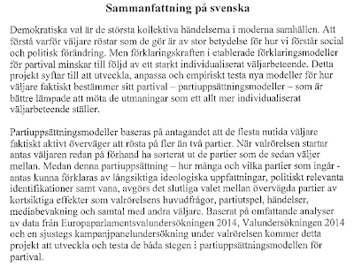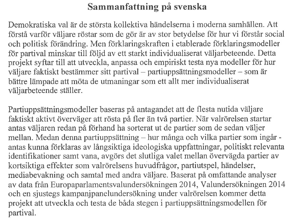 Själv konkurrerar jag och Maria Oskarson med en ansökan för ett projekt betitlat ”Consideration Set Models of Voting Behavior”. I korthet handlar det om att utveckla nya modeller och analysstrategier för att förklara varför väljare röstar som de gör. Inspiration hämtas bland annat från forskningfält som under många decennier märkligt nog har varit styvmoderligt behandlade i analyser av politiskt beteende, däribland marknadsföring och konsumentbeteendeforskning. Projektet har stor potential att förändra vårt sätt att analysera väljarbeteende på eftersom den tar större hänsyn till de faktiska beslutsprocesser som enskilda väljare går igenom i samband med en modern valrörelse.