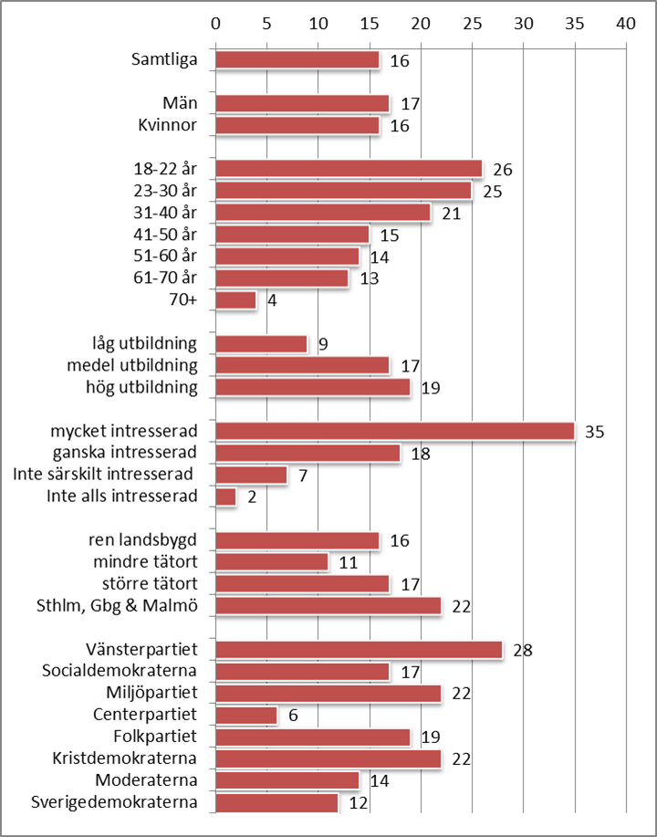 I nordisk och internationell jämförelse tycks nämligen svenska väljare ägna sig betydligt mindre än andra länders väljare åt att försöka påverka varandras partival i samband med valen (Bengtsson et al 2013). De svenska valundersökningarna visar att det som mest är var sjunde svensk väljare som uppger att de under valrörelserna har ägnat sig åt egna försök att påverka någon annans partival (se Oscarsson & Holmberg 2013).