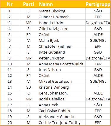 Listan gäller under antagande att väljarna inte förändrar ordningen på partiernas kandidater med hjälp av sina personröster, något som hänt ofta i samband med EP-val historiskt. Vill du läsa mer om personröstning i EP-valen kan du kika i Oscarsson & Holmberg (2010) Väljarbeteende i Europaval. Göteborgs universitet: Statsvetenskapliga institutionen.