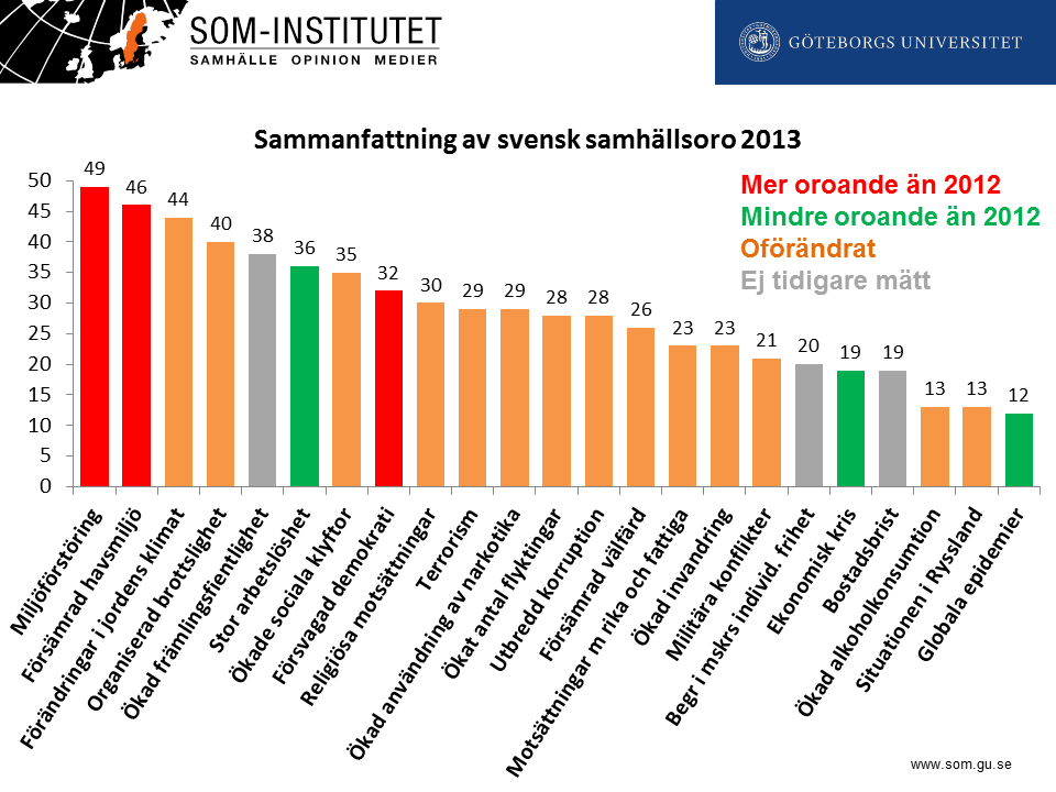 Tre nya områden gjorde debut i 2013 års mätningar: ”Ökad främlingsfientlighet” som gick direkt in på topp-5 med 38 procent ”mycket oroande”, begränsningar i människors individuella frihet (20 procent ”mycket oroande”) och bostadsbrist (19 procent). En fördjupad analys utlovas till den kommande huvudrapporten från SOM-institutet som publiceras den 24 juni 2014..
