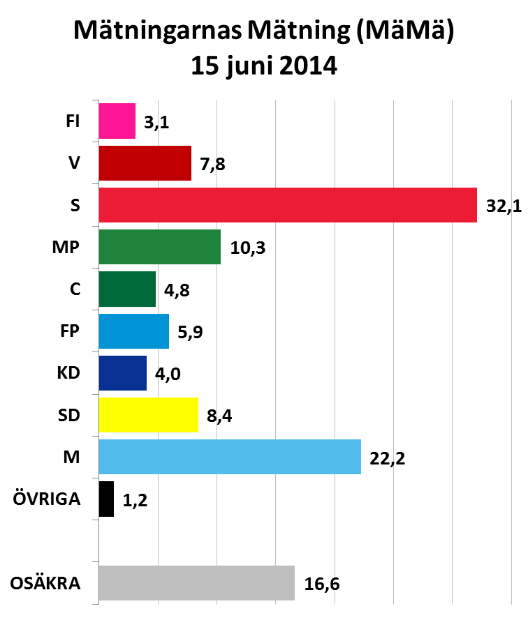 Tills dess kan vi så gott det nu är möjligt få en bild av det aktuella opinionsläget. I den senaste Mätningarnas Mätning finns alla mätningar från Sifo, SCB, Demoskop, Novus och Ipsos med fram till och med den 15 juni. Det aktuella opinionsläget framgår av staplarna nedan. Resultatet visar ett läge som om det vore ett riksdagsvalresultat skulle betyda att väljarna ger alla de nuvarande åtta riksdagspartierna ett nytt kontrakt. Men styrkeförhållandena är dramatiskt annorlunda. Alliansregeringens partier samlar just nu endast 36,9 procent av rösterna medan de rödgröna är klart större. De rödgröna har tillsammans 50,2 procent av rösterna enligt MäMä. Nuvarande opinionsläge betyder alltså sannolikt inte bara regeringsskifte och ny statsminister i Stefan Löfven utan också att Sverigedemokraternas inflytande begränsas till ett minimum under den kommande mandatperioden. Skulle Feministiskt initiativ också ta sig över spärren till riksdagen — partiet når i sammanvägningen 3,1 procent — kan vi alltså få nio partier i den svenska riksdagen. En sådan fragmentisering av partisystemet skulle skapa dramatiskt annorlunda grundförutsättningar för det politiska livet i Sverige.