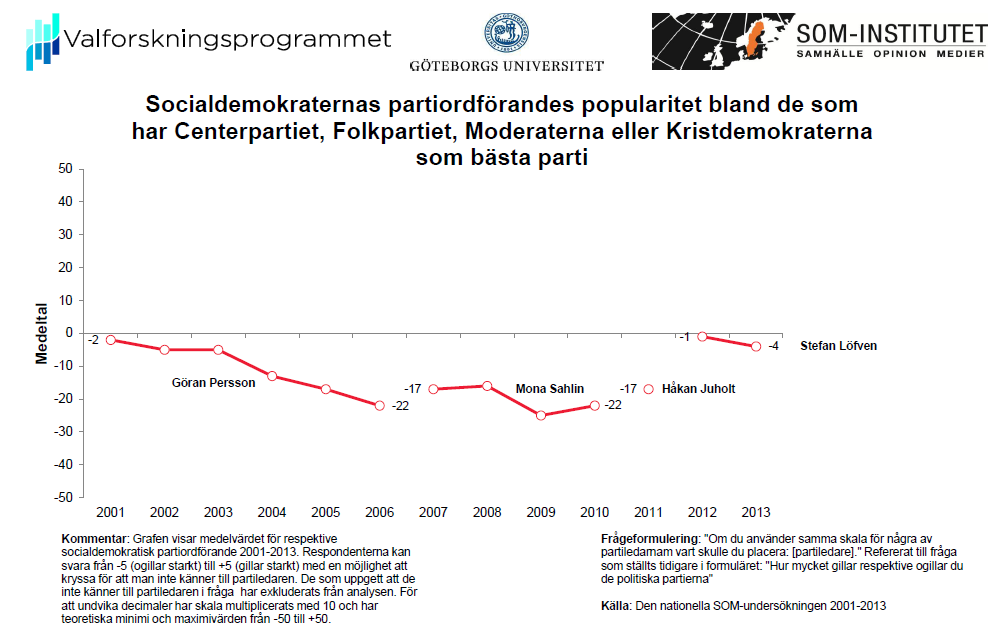 En nyhet för dagen är att Stefan Löfven är klart mindre impopulär bland Allianspartiernas sympatisörer än vad Göran Persson, Mona Sahlin och Juholt varit. Hans genomsnittliga popularitetspoäng på en skala från -50 (ogillar starkt) till +50 (gillar starkt) bland Allianspartiernas sympatisörer är -4 vid den senaste mätningen hösten 2013, klart högre än Juholts -17 från 2011, Mona Sahlins -22 från 2010 och Göran Perssons -22 från hösten 2006.
