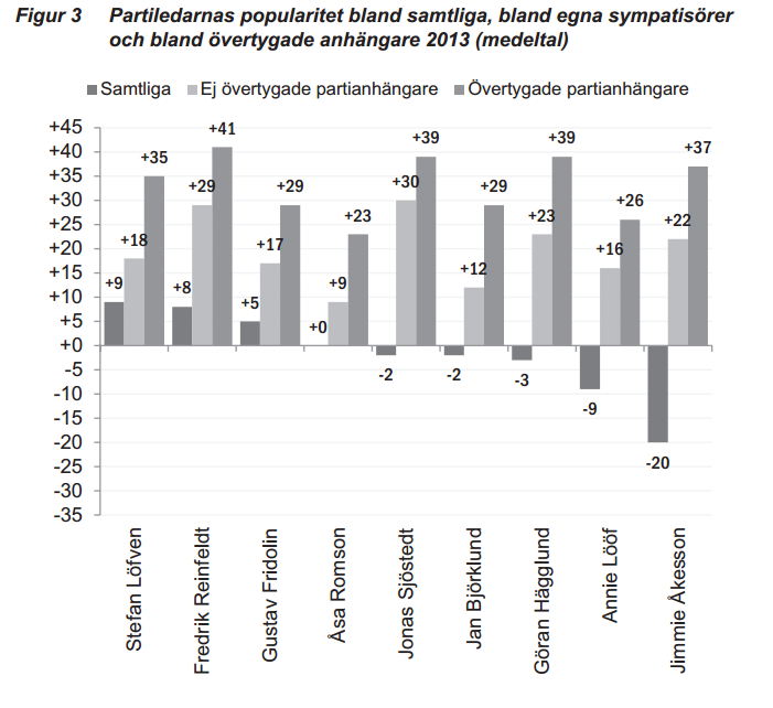 I den nysläppta SOM-antologin ”Mittfåra och Marginal” finns fler analyser av partiledarnas ställning. Det kapitlet laddar du ned i sin helhet här. Där görs bland annat en analys av hur populära partiledarna är bland samtliga svenskar och bland svagt och starkt övertygade partianhängare. Resultaten visar att Stefan Löfven har höga popularitetssiffror (+35) bland de övertygade S-sympatisörerna, men inte lika högt som Reinfeldt har bland de övertygade M-sympatisörerna (+41).