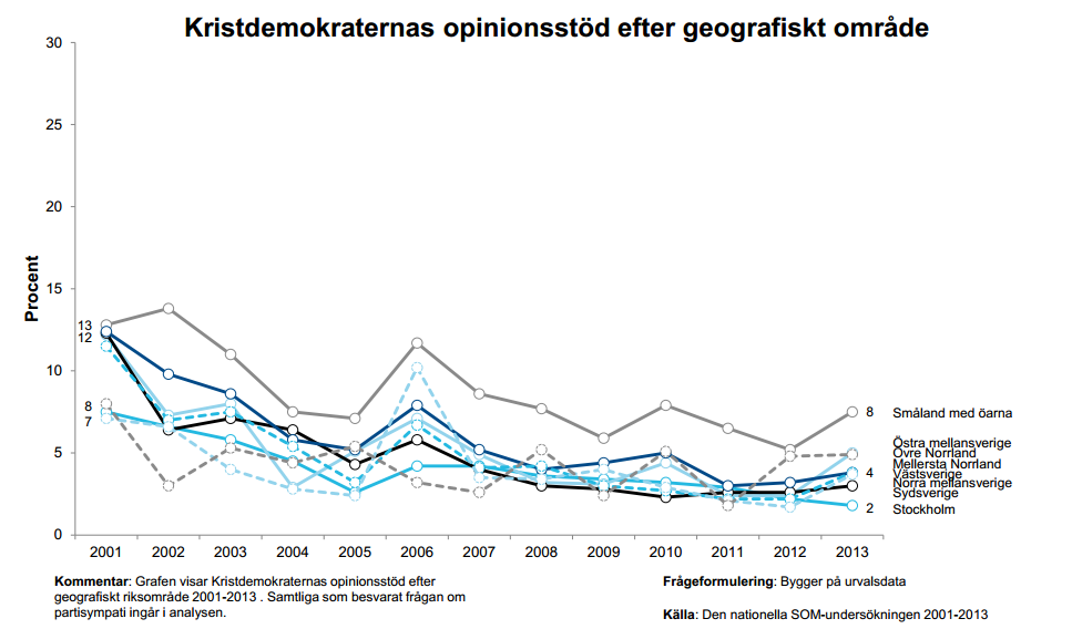Genomgången av Kristdemokraternas opinionsutveckling 2001-2013 är för anhängare av partiet ingen munter läsning. I 2001 års SOM-undersökning erhöll Kristdemokrateran under ledning av Alf Svensson 11 procent av de svarandes sympatier. Siffran 2013 var fyra procent, alltså nästan en tredjedel av det forna sympatistödet. En av de mest anmärkningsvärda noteringarna i Kristdemokraternas nedgång är förlusten av den stora och i så högt grad röstande gruppen pensionärer. 2001 sympatiserande 18 procent (!) av pensionärerna med Kristdemokraterna. Redan 2004 hade den siffran fallit till 6 procent. Gruppen pensionärer är alltjämt en av Kristdemokraterna klart mest lojala. I SOM-undersökningen 2013 erhöll man här 6 procent av de svarandes sympatier, jämfört med 4 procent bland samtliga svarande. Men partiet är idag långt ifrån att vara det pensionärsparti man en gång var, i alla fall sett till sympatisörerans sammansättning.
