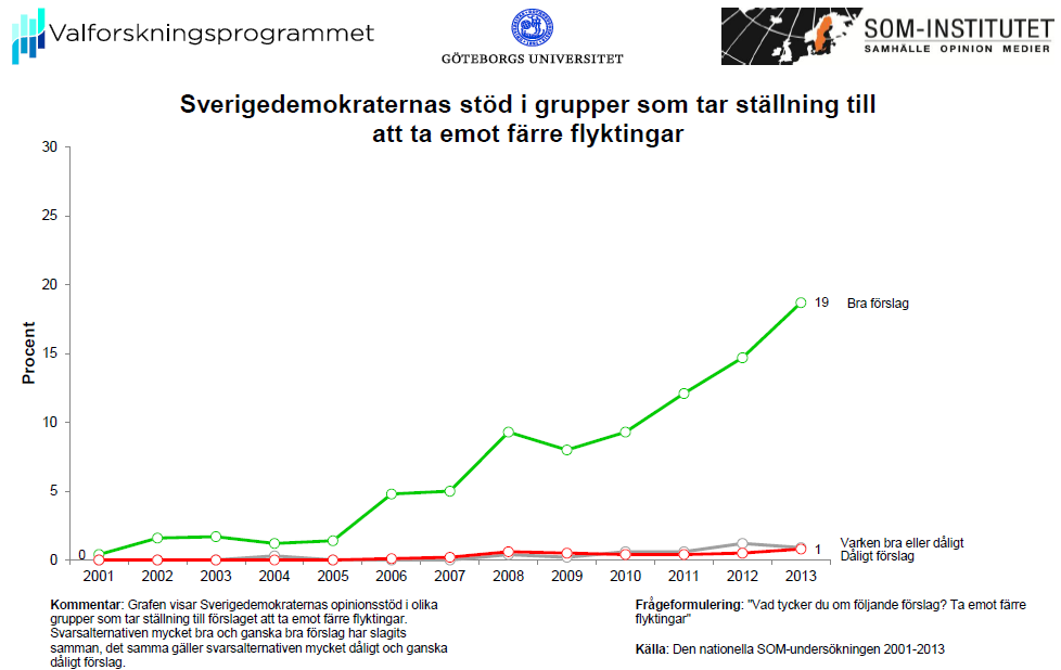 Två spännande tidsserier kan lyftas fram. Den första gäller hur opinionsstödet för Sverigedemokraterna har förändrats i grupper med olika inställning till flyktingmottagning. Den visar att tillväxten för SD uteslutande äger rum i väljargrupper som har en negativ inställning till förslaget att ta emot färre flyktingar. Bland de svenskar som anser att förslaget är dåligt har Sverigedemokraterna vuxit från 0 procent 2001 till 19 procent hösten 2013.