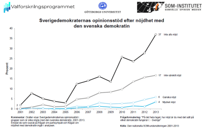En andra tidsserie har med upplevd systemlegitimitet att göra, det vill säga hur nöjd man är med hur demokratin fungerar i Sverige. Sverigedemokraternas opinionstillväxt är här tydligt koncentrerad till missnöjda grupper. I den visserligen relativt lilla gruppen som inte alls är nöjd med den svenska demokratin har SDs opinionsstöd vuxit dramatiskt från 2 procent 2001 till 37 procent 2013. En liknande utveckling finns att ta del av i rapporten när det gäller allmänt politikerförtroende och förtroende för riksdagen och regering.
