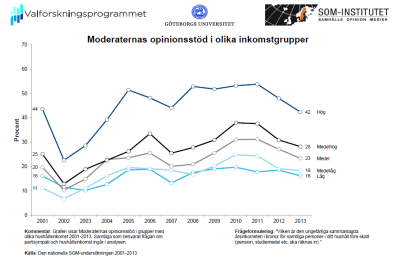 Det är Moderaternas dag i Almedalen idag och nu släpper vi partirapporten om partiets opinionsutveckling 2001-2013. Data är hämtade från de årligen återkommande SOM-undersökningarna. Analyserna utgör ett led i Valforskningsprogrammets forskning som en förberedelse inför valåret 2014. Rapporterna för de åtta riksdagspartierna är identiska till sitt innehåll.