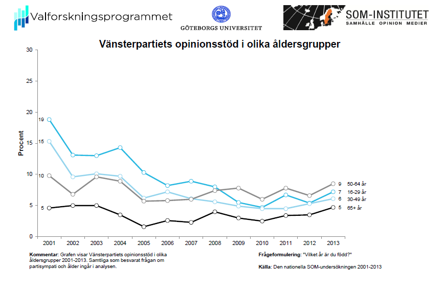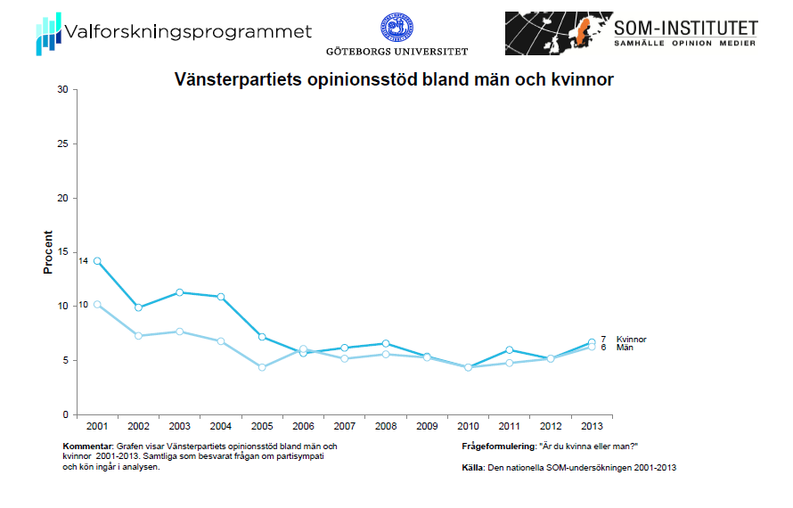 Två intressanta tidsserier som är värda att lyfta fram i Vänsterpartiets opinionsutveckling är den över kön och den över ålder. I början av vår mätserie är det tydligt att Vänsterpartiet har två av sina starkaste grupper bland kvinnor och bland de allra yngsta (16-29 år). Vänsterpartiets starkaste grupp alla kategorier är unga kvinnor (24 procent 2001, se sid 10 i rapporten). Detta mönster kvarstår fram till 2006 även om opinionsstödet alltjämt sjunker, men därefter händer något. Från och med 2006 är Vänsterpartiet lika populärt bland män som bland kvinnor och de klara åldersskillnader som fanns i början av 2000-talet suddas ut i och med att partiet tappar både bland de yngsta, men också bland den yngre medelåldern (30-49 år). Mest dramatiskt är tappet av de forna kärntrupperna, de unga kvinnorna. I 2013 års mätning är partiet faktiskt något mer populärt bästa parti bland män mellan 50 och 64 år (8 procent) än bland kvinnor 16-29 (7 procent). Vid en bredvidläsning av vår rapport om Miljöpartiet som släpptes tidigare i veckan är det ingen vågad gissning av Miljöpartiet lyckats kapitalisera på Vänsterpartiets tidigare väljargrupper.