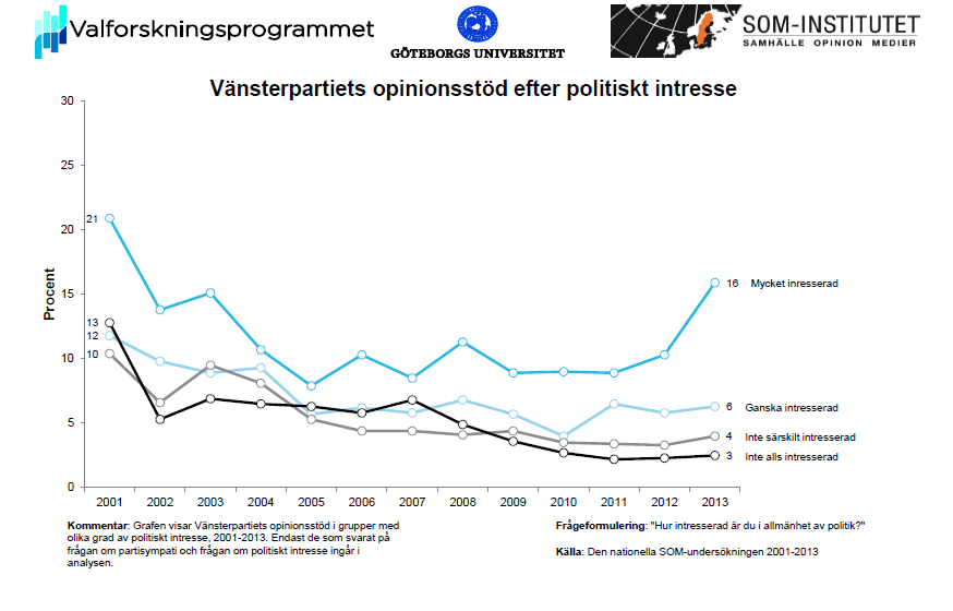 För att göra en bra valrörelse krävs att partierna lyckas väcka engagemang och intresse hos sina kärnväljare så att man ser till att de som sympatiserar med partiet faktiskt också går och röstar. Sett utifrån det här perspektivet är tidsserierna över stödet i olika grupper av politiskt intresse och politisk diskussionsfrekvens en glad läsning för Vänsterpartiet. Av de som 2013 sa sig vara ”mycket politiskt intresserade” uppgav 16 procent Vänsterpartiet som bästa parti. Samma överrepresentation, om än inte lika stor (12 procent) återfinns i gruppen som anger att de diskuterar politik ”någon gång i veckan eller oftare”.