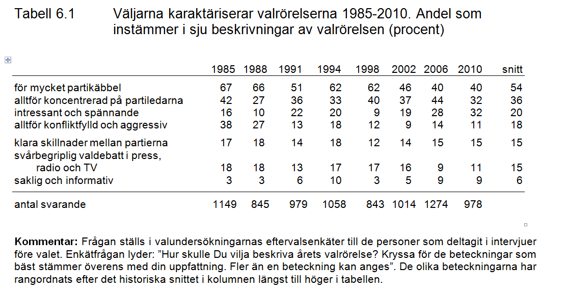 Den beskrivning av valrörelsen som flest väljare instämde i var som vanligt att det varit ”för mycket partikäbbel”. Men partikäbblet tangerade också historiskt låga nivåer (40 procent). Andelen som uppfattade valrörelsen som svårbegriplighar varit klart lägre i samband med 2006 och 2010 års val (9 respektive 11 procent) än tidigare i den svenska valrörelsehistorien. De två senaste valrörelserna bedöms dessutom ha varit mer sakliga och informativa (9 procent) än andra valrörelser de senaste tjugofem åren, undantaget valrörelsen 1994. Ett historiskt sett bra betyg alltså, om vi frågar väljarna själva.