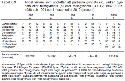 Kommentar: Frågan ställs i valundersökningarnas eftervalsenkäter till de personer som deltagit i intervjuer före valet. Enkätfrågan för valen 1985-1991 lyder: ”Tycker du att det samlade programutbudet i TV inför valet gynnade eller missgynnade något eller några av partierna?”. I 2010 års valundersökning användes frågeformuleringen ”Tycker du att massmedierna gynnat eller missgynnat något eller några av partierna i årets valrörelse?”. Svarsalternativen var desamma vid alla tillfällen: ”Har gynnats i medierna”, ”Har varken gynnats eller missgynnats” och ”Har missgynnats i medierna”.