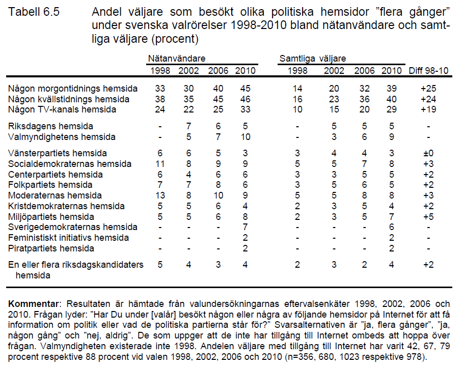 Besöken på partiernas hemsidor blir också mer frekventa. Andelen som besöker någon eller några av partiernas hemsidor har totalt sett dubblerats från 8 procent 1998 till 19 procent 2010 (jfr tabell 6.3). Resultaten i tabell 6.4 visar att Moderaternas, Socialdemokraternas och Miljöpartiets hemsidor var något mer välbesökta än Kristdemokraternas och Vänsterpartiets hemsidor i samband med 2010 års val. Sverigedemokraternas hemsida besöktes av sex procent av väljarna.