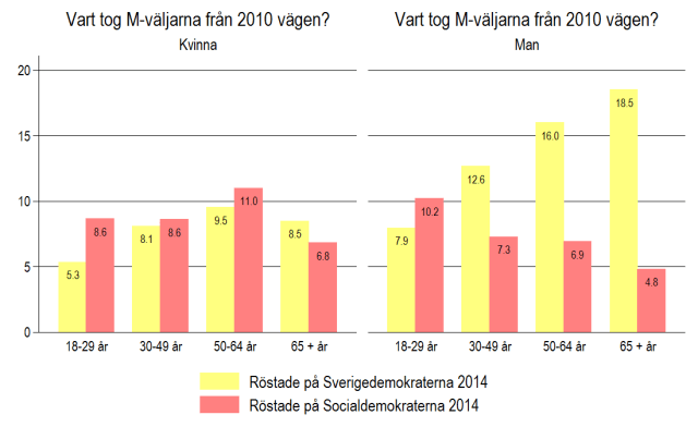 Preliminära analyser av dessa strömmar visar att det var väldigt olika typer av M-väljare som bytte till Sverigedemokraterna respektive Socialdemokraterna. Vallokalsundersökningen visar att bytena från M till SD var avsevärt vanligare bland äldre män (se figuren nedan) än i andra köns- och åldersgrupper. Väljarprofilen för de Moderata väljare som gick till Socialdemokraterna är den omvända, här var strömmarna större bland yngre män än bland äldre män.