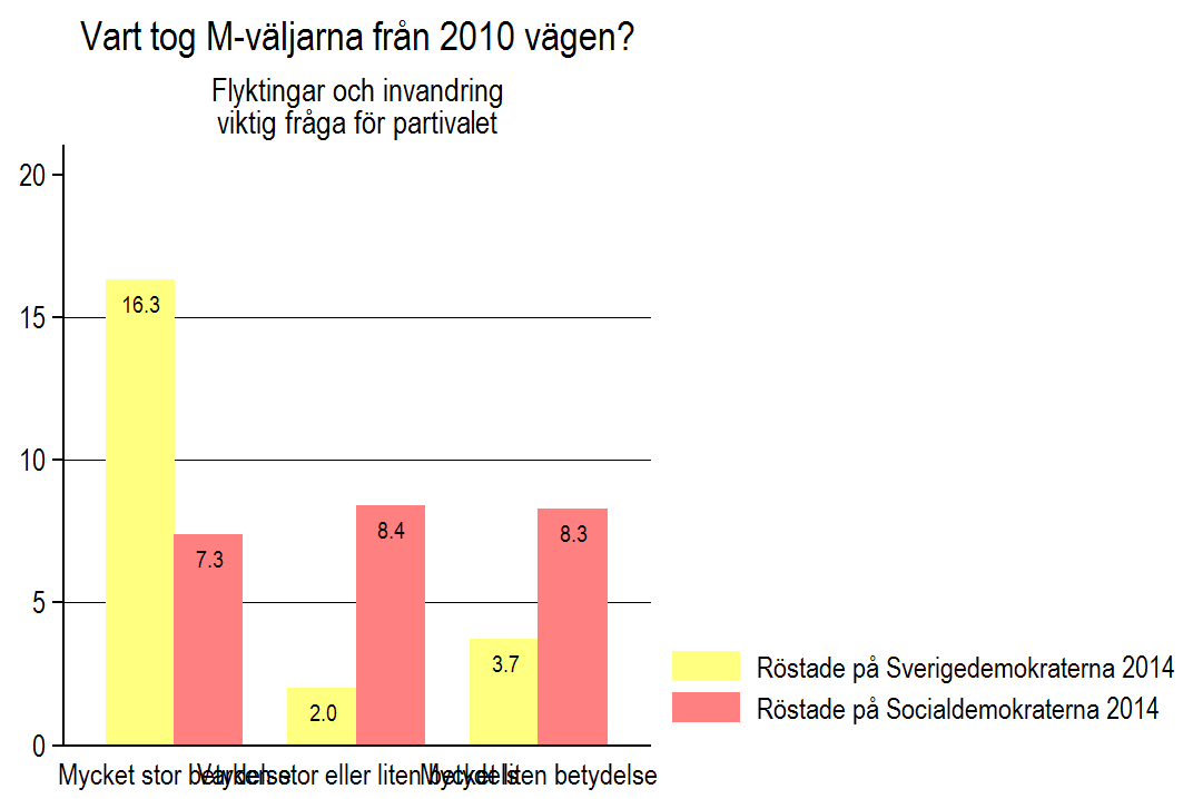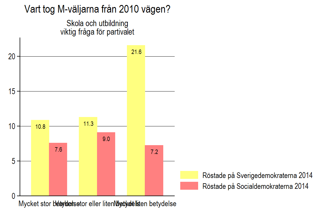 De väljare som SD ärvt från Moderaterna tycks inte ha haft huvudfokus på någon annan välfärdsfråga än äldrevården, vilket också förklarar åldersprofilen för de strömmar som gick från M till SD. För andra välfärdsfrågor som sjukvård och skola/utbildning är det tvärtom så att låga prioriteringar ökar sannolikheten för ett byte till SD. Detsamma gäller för frågor som vinster i välfärden och skatter, det vill säga klassiska vänster-högerrelaterade sakområden. Det stärker bilden att en huvuddel av Sverigedemokraternas väljare är indifferenta när det gäller vänster-högerideologi. Det är andra ideologiska dimensioner än vänster-höger som är viktiga för att förklara röstning på SD. Analysen från tidigare val gäller med andra ord fortfarande.