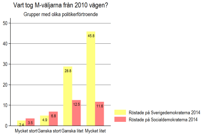 Det lägre politikerförtroendet, flykting- och invandringsfråga samt missnöje med äldreomsorg och brottslighet tycks enligt vallokalsundersökningen ha varit viktiga motiv för Moderata väljare 2010 att byta till Sverigedemokraterna 2014.