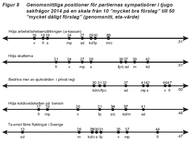 För att få stöd att tolka vilka värderingar som kan ligga till grund för strukturen i väljarnas ogillande och gillande av partier och ledare tar vi nästa steg i analysen av konfliktstrukturen i partisystemet. I figurerna nedan redovisas analyser av partiväljarnas åsikter i tjugo av de sakfrågor som ställdes till respondenterna i 2014 års SOM-undersökning. Sakfrågorna är rangordnade efter hur stark grad av politisering de har, det vill säga hur stora och systematiska skillnaderna är i ståndpunkter mellan olika grupper av partiväljare.