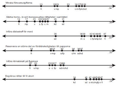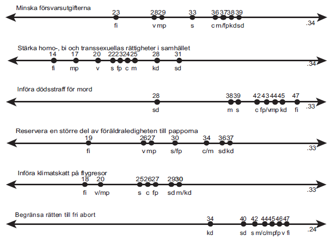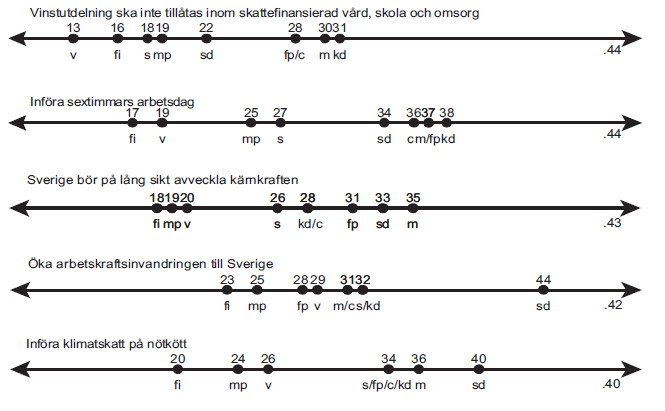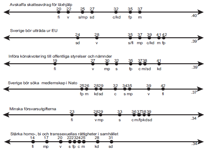 Listan över vilka sakfrågor som är starkast politiserade – det vill säga starkast partiskiljande på väljarnivå – i det svenska partisystemet visar som förväntat att flera av de klassiska vänster-högerfrågorna hamnar i topp. För dessa sakfrågor känns rangordningen av partiernas väljare från vänster till höger väl igen. Men det börjar bli lite stökigt även i dessa rangordningar jämfört med tidigare. Centerpartiets väljare står exempelvis längs till höger när det gäller frågan om att höja arbetslöshetsersättningen, och kristdemokraternas väljare längst till höger i frågan om att höja skatterna. Och Moderaterna är inte som tidigare det självklara partiet som står längs till höger i partisystemet i frågor som rör offentliga sektorns storlek, skattenivåer eller privatiseringar. Flankpartiet längs vänster-högerdimensionen är oftare än tidigare inte Moderaterna utan något av de andra allianspartierna.