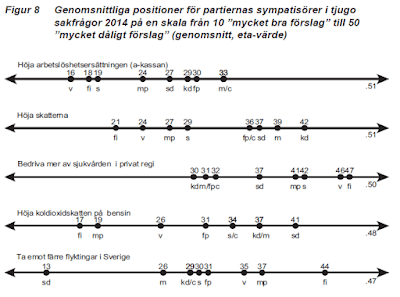 Två icke-vänsterhögerrelaterade sakfrågor når 2014 högre på listan över mest politiserade sakfrågor än vad de gjort tidigare. Det gäller för det första frågan om att höja koldioxidskatten på bensin (.48) som är starkt partiskiljande med FI- och MP-väljare starkt positiva till förslaget medan Sverigedemokraternas väljare är starkt negativa. För det andra gäller det frågan om att ta emot färre flyktingar i Sverige (eta=.47) där FIs och SDs väljare står extremt långt ifrån varandra. Så gott som alla SD-väljare tycker förslaget är mycket bra medan så gott som alla FI-väljare tycker förslaget är mycket dåligt. Gröna frågor och frågor om flyktingmottagning påminner om varandra när det gäller partiväljarnas rangordningar längs åsiktsdimensionerna. FI, V och MP-väljare tenderar att gruppera sig tillsammans på ena sidan medan SD, KD och M-väljare grupperar sig tillsammans på den andra, medan Socialdemokraternas väljares positioner inte går att skilja från övriga allianspartiväljares hållningar. S-väljarna är inte lika toleranta och gröna som V, FI och MP.