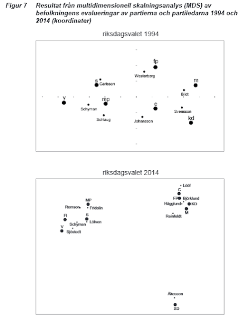 Resultaten från analysen visar att det räcker med två dimensioner för att på ett tillfredsställande sätt beskriva de inbördes avstånden mellan partier och partiledare. I figuren ovan redovisas partier och partiledares inbördes avståndsrelationer 1994 och 2014. Jämförelsen med 1994 års konfliktstruktur visar på ett väldigt tydligt sätt hur det svenska partisystemet har blivit en tripolär struktur med de rödgrönrosa partierna, allianspartierna och Sverigedemokraterna som var sin tydlig gruppering. På 1994 års karta sprider partierna ut sig relativt jämnt i den politiska rymden, men 2014 är laguppställningarna betydligt mer självklara.