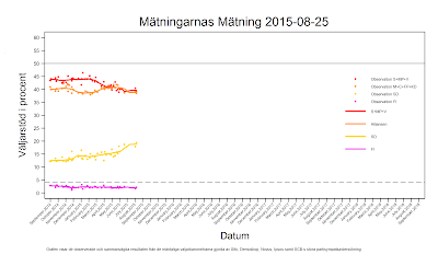 Med två nya Augustimätningar har vi uppdaterat vår poll of polls, Mätningarnas Mätning (MäMä) som bekräftar Sverigedemokraternas framgångar i opinionen under sommaren. Grafen nedan visar hur styrkeförhållandena mellan regeringsunderlaget (V-S-MP), Allianspartierna (C-FP-KD-M) och Sverigedemokraterna (SD) ser ut så här ett år efter att valrörelsen inför 2014 års val tog sin början. Med pågående flyktingkatastrof — den största sedan andra världskriget — med storkrig i Mellanöstern, krigshandlingar i Ukraina, terroristdåd och oroliga börser gör sig världen påmind i den nationella bubbla som svensk politik har befunnit sig i under lång tid. Stark oro präglar opinionen. Det ställer krav på samling, ansvarstagande och handlingskraft från envar och förtroendevald.