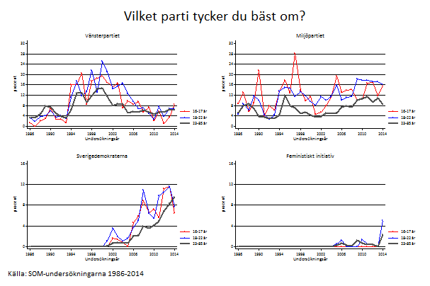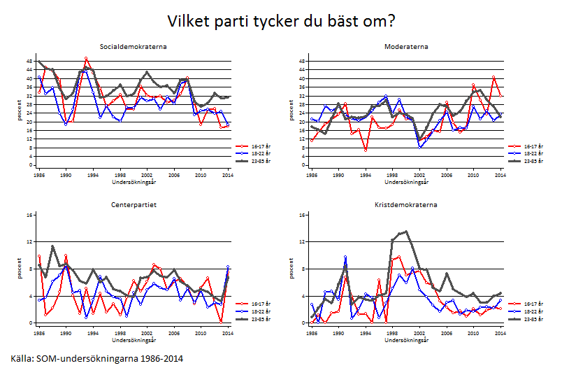 I SOM-institutets undersökningar ingår alltid personer som är yngre än 18 år. Skiljer vi ut 16- och 17-åringarna (röd linje) från dagens förstagångsväljare (blå linje) visar det sig för det första att det inte finns några dramatiska skillnader mellan de två grupperna under de senaste 30 åren. Precis som Mikael Persson konstaterat tidigare kan vi sluta oss till att 16-åringar med mycket stor sannolikhet skulle rösta ungefär på samma sätt som något äldre 18-22 åringar. För det andra berättar historien att det inte råder särskilt stor beständighet när det gäller vilka partier som går bättre bland personer som är yngre än den nuvarande rösträttsåldern. Det parti som tycks ligga stabilt lägre är Socialdemokraterna. Det parti som tycks ligga stabilt högre är Miljöpartiet.