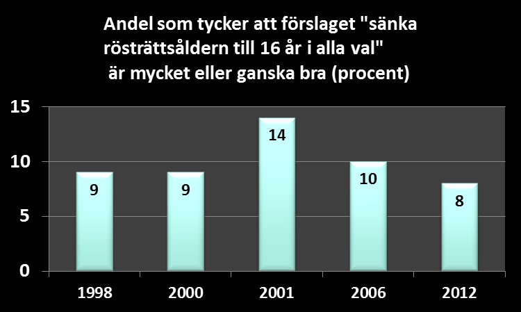 Jag har undersökt svenska väljares inställning till sänkt rösträttsålder vid ett flertal tillfällen de senaste tjugo åren. Inställningen har varit mycket avvaktande. Endast en liten minoritet — mellan 8 och 14 procent — har under åren uppgett att det är ”mycket bra” eller ”ganska bra” förslag. Inte heller de medborgare reformen handlar om — 16- och 17-åringar — uppbådar särskilt stor entusiasm för att få möjlighet att rösta.