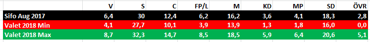 Tar vi det historiska snittet över femton val — två komma tre — och använder det för att beräkna de genomsnittliga min- och maxvärdena för partierna på basis av Sifos augustimätning 2017 får vi följande uppställning för de olika partierna (se tabellen nedan). Vänsterpartiet fick 6,4 procent i senaste Sifo. Vi vet förstås inte någonting om huruvida V kommer öka eller minska sitt väljarstöd under de 12 månader som är kvar. Hur vinster- och förluster av väljare kommer fördela sig mellan partierna den här gången är skrivet i stjärnorna även om vi får kläm på hur stora rörelser vi kan förvänta oss givet historien. En rörelse för V uppåt eller nedåt som motsvarar det historiska snittet 2,3 skulle ge ett minsta värde på 4,1 och ett högsta värde kring 8,7. Motsvarande min-maxintervall för Sverigedemokraterna är 16,0-20,6. Och så vidare.