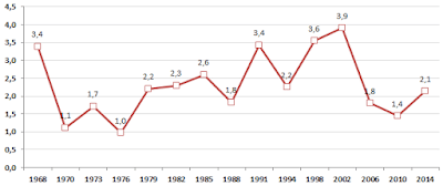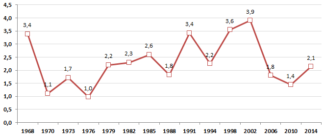 Hur är det då ett helt år före ett val? Genom att ta hjälp av septembermätningarna från Sifo ett år före valet kan vi försöka närma oss ett svar på frågan hur stora förändringar av partiernas styrkeförhållanden som vi kan förvänta oss om det närmaste året uppför sig ungefär likadant som sista året före ett val har gjort hittills i den svenska valhistorien. Vi kan gå tillbaka och jämföra 15 tidigare fall. Grafen nedan visar hur stora avvikelserna har varit — mätt som medelfel per parti — mellan Sifos septembermätning året före riksdagsvalen 1968-2014.