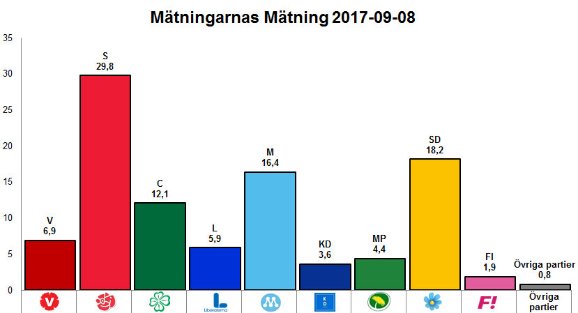 ka man gissa? Nä, man kommer bara lura sig själv att tro något på grundval av fåfänga, och övertro på att kunna dra slutsatser av det man tror är relevant. men kanske är det inte helt osannolikt att påstå:S varken vinner eller förlorar jämfört 2014.SD kommer att öka med 5 – 20 mandat, (det är stort spann, och innebär motsvarande minskning hos andra….M bör minska något, om SD ökarOm M ligger på nuvarande nivå, ökar sannolikheten att Kd kommer in, pga kamratstöd.C ligger på runt 10 och ligger i samma farliga läge som Mp 2014, alltså om överskattningen ligger någonstans, pga underskattning av SD, så ska balansen jämnas ut, och sannolikt är mp redan dränerat avs osäkerhetsmarginalen -14.Vilka partier kommer att minska, om SD ökar? Ja det är det som är den svåra och svåra frågan, givet att hypotesen om SDs underskattning ligger kvar som politisk risk, det kan inte uteslutas att gruppen ungdomar och kvinnor kommer att vara fler som faktiskt röstar på SD, än vad som uppges, av en rad orsaker.Om det inte är S som tappar till underskattning av SD, och en del redan är borträknad från M, så faller lotten på omätbara dolda förluster på Mp, C eller Fp eller Vp, och det inser alla, är så dumt så det inte är sant, alltså dumheter, och därmed blir slutsatsen att bollen är synnerligen rund. Ska bli spännande att ta del av SCBs novembermätning, och vilka fanstyg som all sköns makter ställer till med för att påverka valet. Frågan är mer vilka hyss och fanstyg som de hittar på. S.W