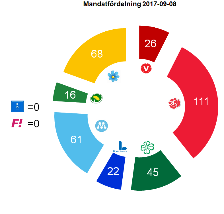 En mandatfördelning byggd på sammanvägningen ger en riksdag med sju partier och där rödgröna är avsevärt större (153 mandat) än Allianspartierna (118) eftersom Kristdemokraterna blir utan mandat (Kd kan kanske konkurrera om ett (1) riksdagsmandat i Jönköping om de når över 12 procent där). Sverigedemokraterna har 68 mandat. Den enda minsta vinnande koalition med ideologiskt närliggande partier som just nu når över den magiska gränsen på 175 mandat och riksdagsmajoritet är Socialdemokraterna, Centerpartiet och Liberalerna som tillsammans når 178.