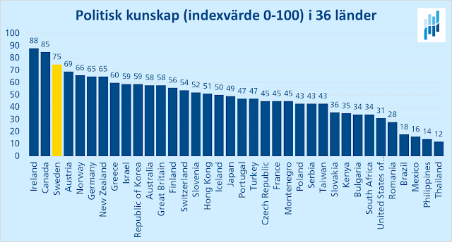 Länderrankingen nedan är en sammanfattning jag gjort av svaren på de fyra kunskapsfrågor som ingick i den tredje omgången av det globala samarbetsprojektet CSES. Det brukar betraktas som ett bra försök, men inte tillräckligt bra, att samla in jämförbara mått på politisk kunskap. Jag har gjort ett index för de fyra frågorna där Sverige får ett indexvärde på 75. Svenska väljare har alltså rätt på i genomsnitt 3 av 4 kunskapsfrågor. Det går sämre för väljare i andra delar av världen. De amerikanska väljarna har ett indexvärde på 31, för att ta ett exempel.