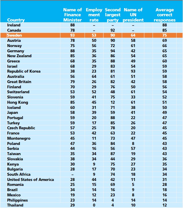 Svenska väljare kan tacka Anders Borg och Moderaterna för topplaceringen just den här gången. Närmare nio av tio svenska väljare visste att Anders Borg var finansminister och att det näst största partiet i valet 2014 blev Moderaterna. Sämre ställt var det med kunskaperna om Ban Ki Moon. Nästan två tredjedelar (64 procent) pekade korrekt ut honom som FNs generalsekreterare. Med kunskaper om arbetslösheten var allra sämst: hälften av svenskarna (53 procent) visste att arbetslösheten var 8 procent. Flervalsfrågor med fyra alternativ användes i varje enskild kunskapsfråga.