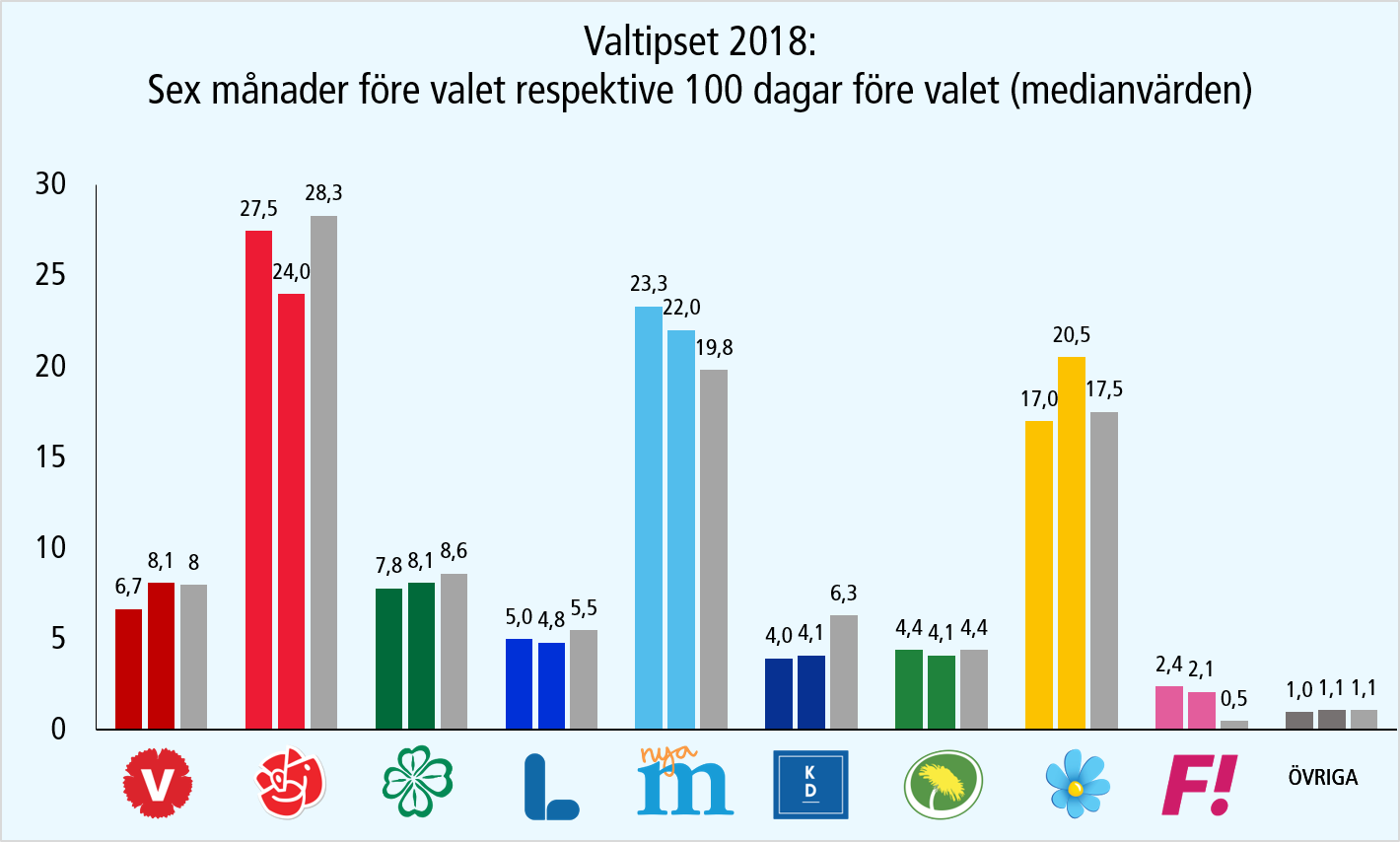 Som vanligt var de flesta tips kraftigt påverkade av nyligen publicerade opinionsmätningar. Det innebar att medelfelet per parti var ovanligt högt — precisionen alltså låg — i förhållande till liknande tips som jag anordnat i samband med tidigare val. De som tippade sex månader före valet kom relativt nära både Socialdemokraterna och Sverigedemokraterna men överskattade Moderaterna. De som tippade 100 dagar före valet tenderade att underskatta Socialdemokraterna och Kristdemokraterna och överskatta Sverigedemokraterna.