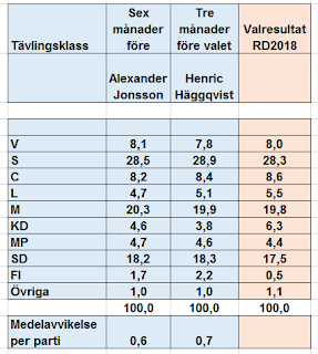 Nu är valtipset 2018 avgjort! Vinnaren av årets valtips i sex-månader-före-valet-klassen blev Alexander Jonsson med ett medelfel per parti som var 0,60 procentenheter. Grattis till Alexander!
