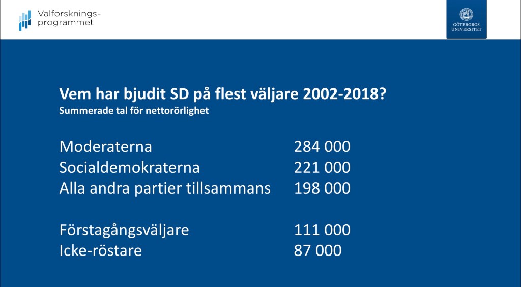 En återkommande diskussion är varifrån Sverigedemokraterna egentligen har hämtat sina många nya väljare sedan 2002. I rapporten ”Flytande väljare 2018” som kan laddas ned från Valforskningsprogrammets hemsida använder vi våra bytarmatriser för att beräkna nettoströmmar mellan valen. Vi översätter sedan procentberäkningarna till tusentals väljare för att få ett bättre grepp om hur många väljare det egentligen rör sig om.