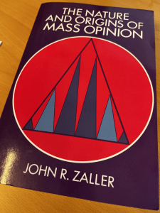 För alla som intresserar sig för den allmänna opinionen — eller tänker sig vilja påverka den i någon riktning — finns all anledning att alltid ha en kopia av John R Zallers ”The Nature and Origins of Mass Opinion” (1992) i bokhyllan. Denna moderna klassiker har nu mer än trettio år på nacken men är fortfarande omöjlig att bortse från när man funderar över hur och varför vi formar de åsikter som vi gör. Jag har själv köpt om boken flera gånger eftersom utlånade exemplar haft en stark tendens att inte lämnas tillbaka. Nu finns den i 18e (!) tryckningen.
