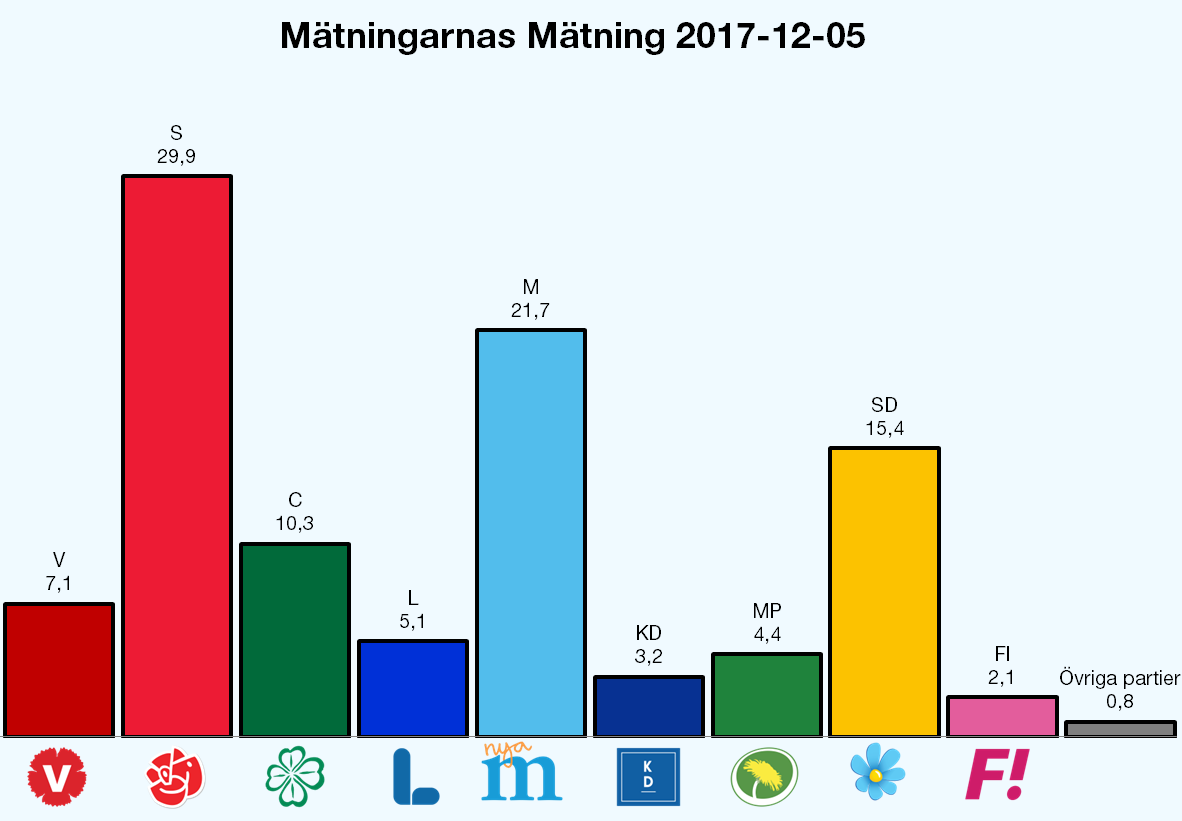 Här är grafiken för den senaste sammanvägningen. På basis av beräkningarna kan vi också räkna ut hur många mandat partierna skulle få om sammanvägningen vore ett valresultat.